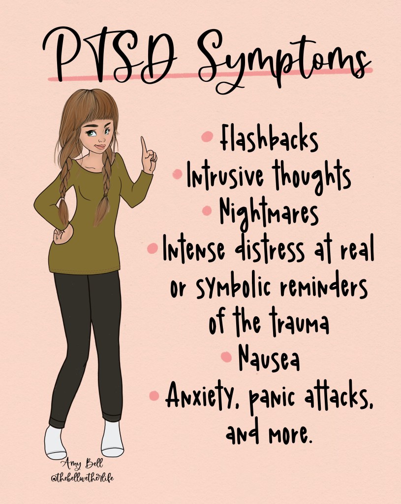 PTSD isn’t just something that can happen to soldiers, but to anyone whose been through a traumatic event. Symptoms of PTSD can include: flashbacks, intrusive thoughts, nightmares, intense distress at real or symbolic reminders of the trauma, nausea, anxiety and more.